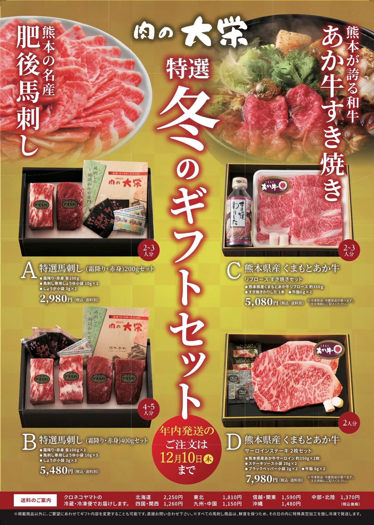 肉の大栄ではおなじみの大好評【肥後馬刺し】と【くまもとあか牛】をご用意しております。